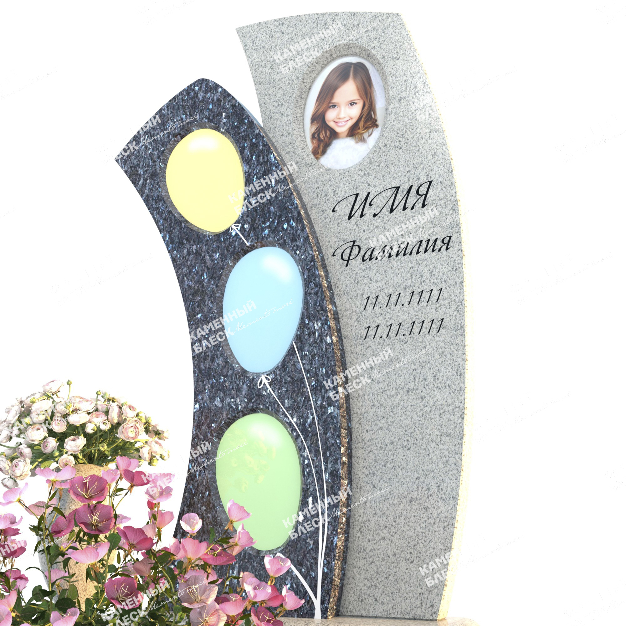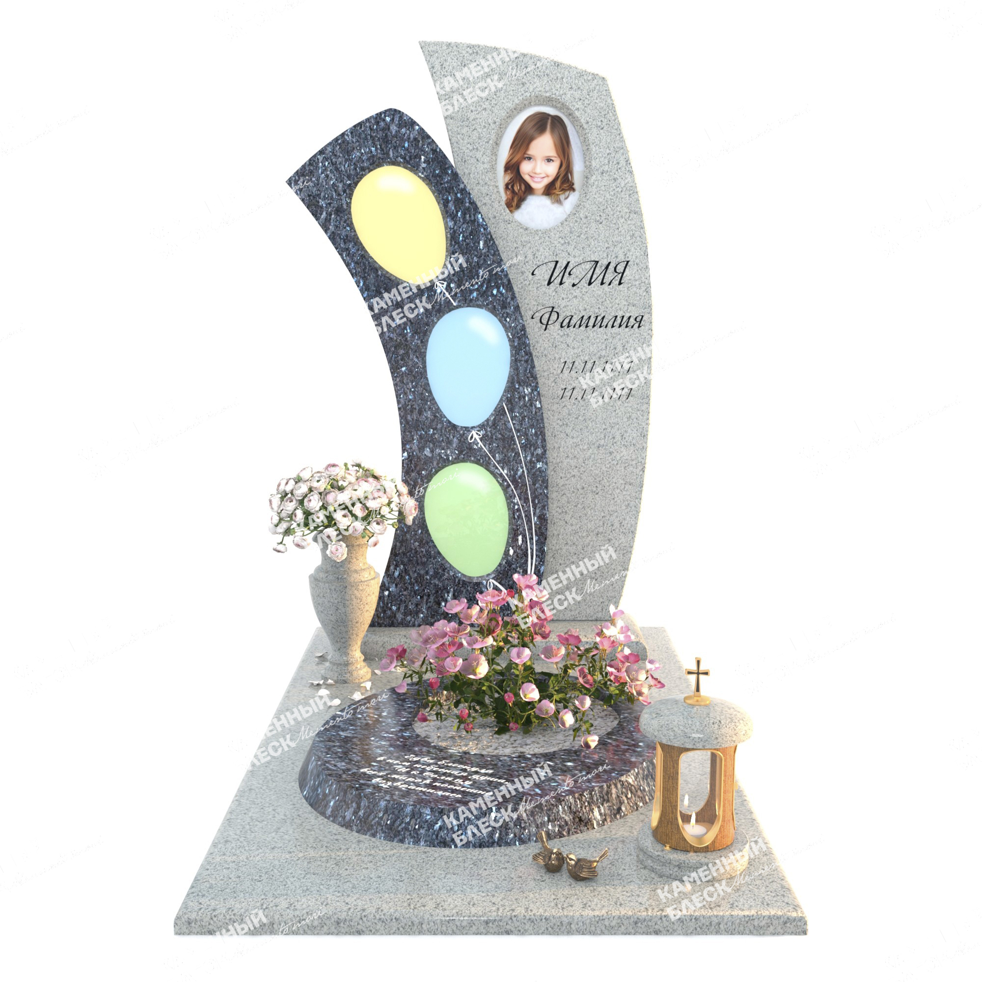Эксклюзивный детский памятник, выполненный в небесном цвете Норвежского гранита Блю Пёрл в сочетании с гранитом Мансуровским. Необычные формы стел украшенные стеклянными медальонами в форме воздушных шаров отражают индивидуальность. Художественное оформление выполнено глубоким пескоструем в белом цвете, фото медальон выполнен из закаленного стекла и врезан в стелу из гранита Блю Пёрл.