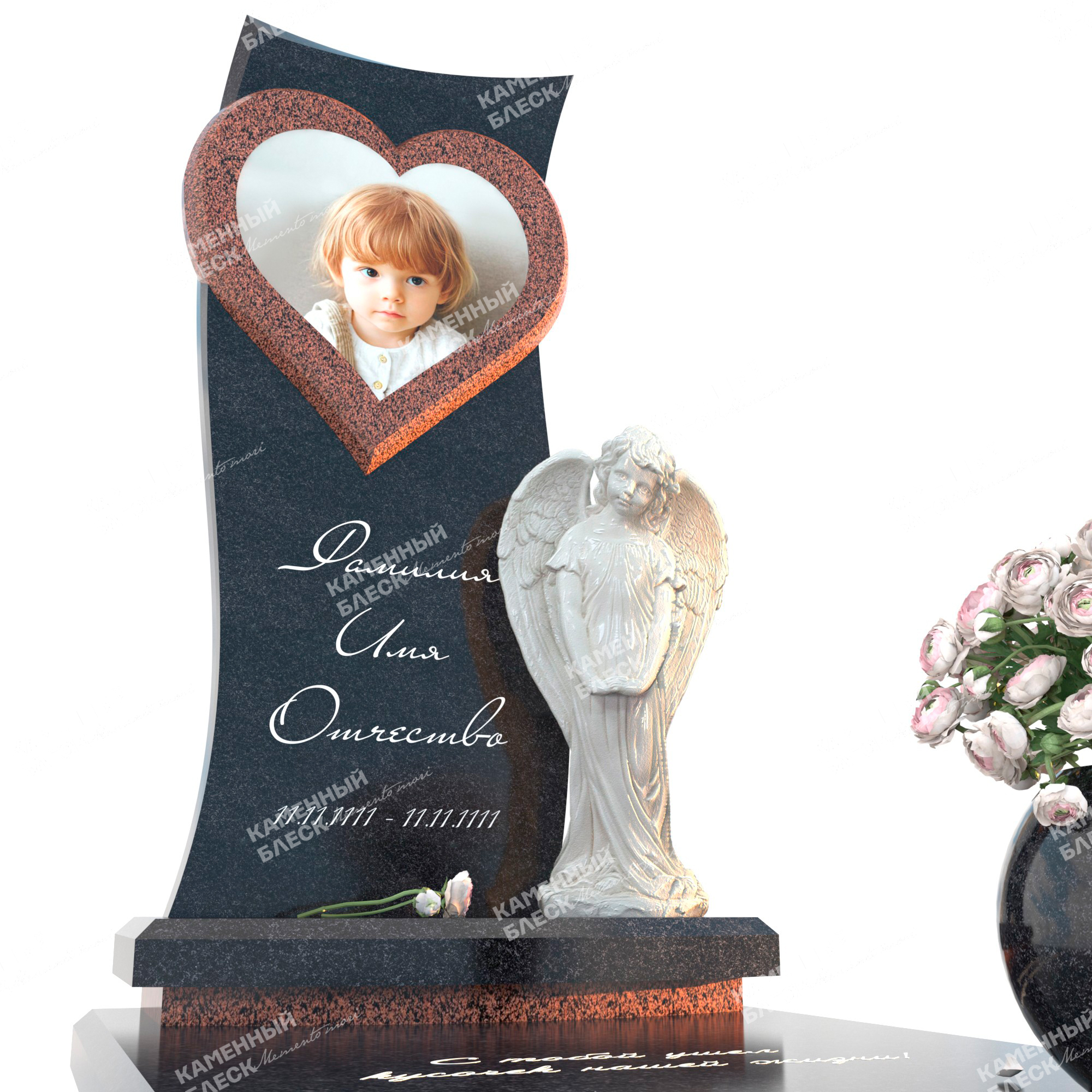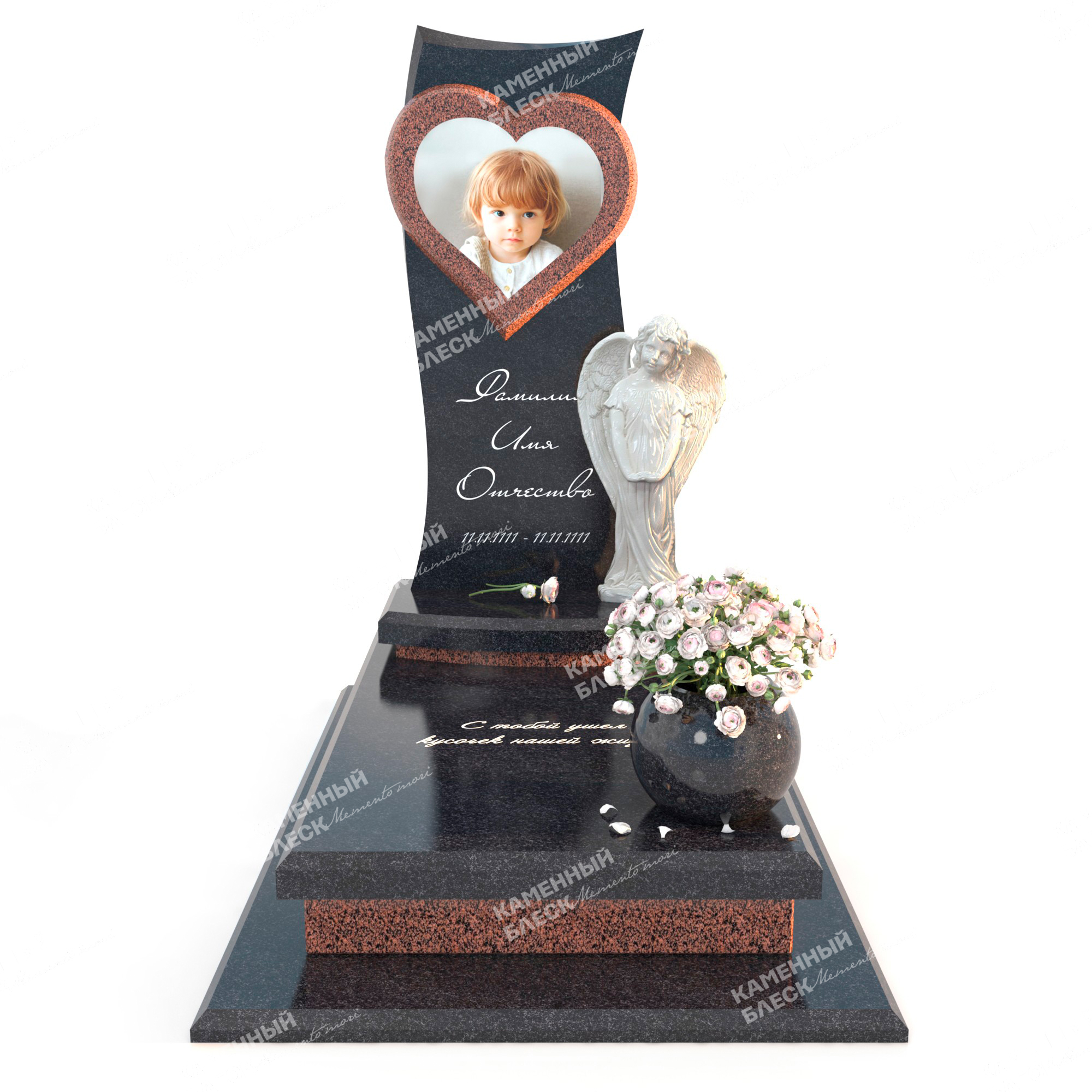 Детский эксклюзивный памятник со стеклянным медальоном. Боль потери самого дорогого человека родные хотят воплотить в необыкновенном, трогательном, самом красивом и нежном исполнении. Данная модель памятника выполнена в сочетании двух цветов гранита Габбро-Диабаз и Лезниковский, которые прекрасно дополняют друг друга. Художественное оформление выполнено, глубоким пескоструем , в белом цвете, а цветной медальон выполнен из закаленного стекла в форме сердца. Данную композицию, возможно, дополнить различными элементами декора, например, вазой, лампадой, скульптурой и другое.