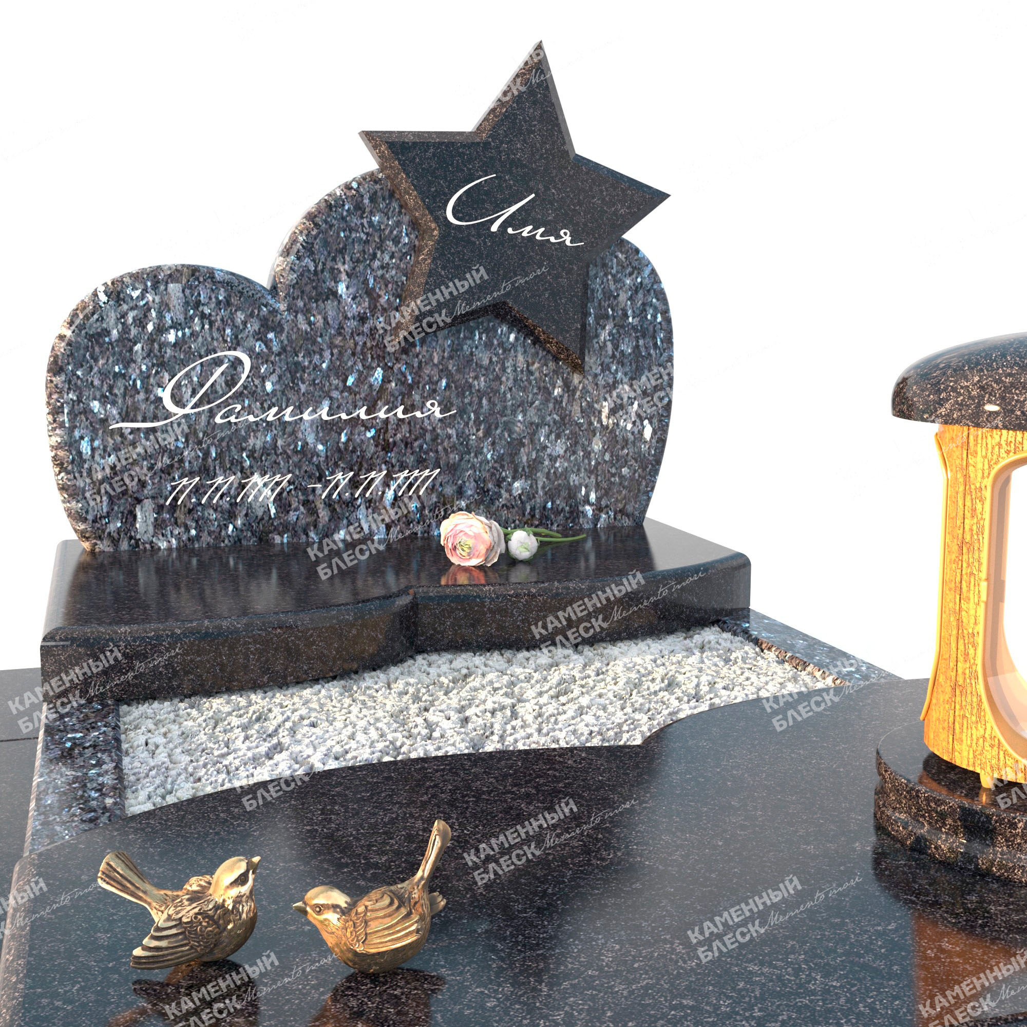 Эксклюзивный детский памятник выполнен в сочетании двух видов гранита: Блю Перл и Габбро-Диабаз. Стела изготовленная с применением художественной резки в форме сердца придает комплексу больше уникальности, а информация нанесенная при помощи глубокого пескоструя создает более объемный и красивый текст. Так же мемориал можно дополнить различными элементами декора, такие как: лампада, ваза, статуэтка и др.