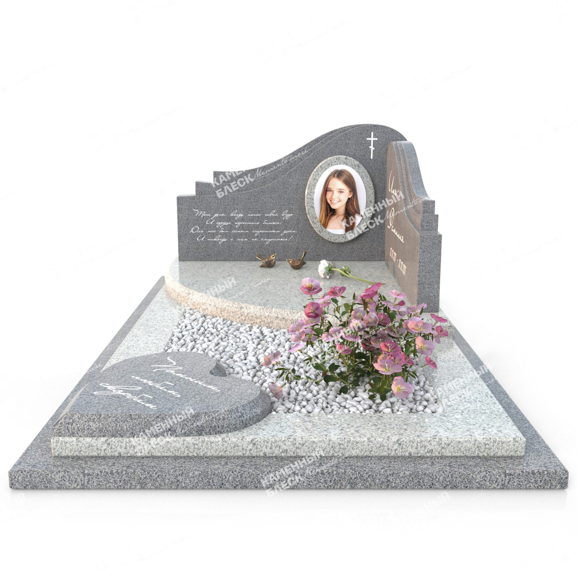 Эксклюзивный детский памятник изготовлен из двух разновидностей гранита: Куру Грей и Мансуровский. Угловая стела выполнена в европейском стиле и украшена цветным медальоном высокого качества из закаленного стекла. Сердце на надгробной плите с эпитафией нанесенной при помощи глубокого пескоструя создает красивый объемный эффект. Данную композицию можно дополнить различными элементами декора: статуэтка, ваза, лампада.
