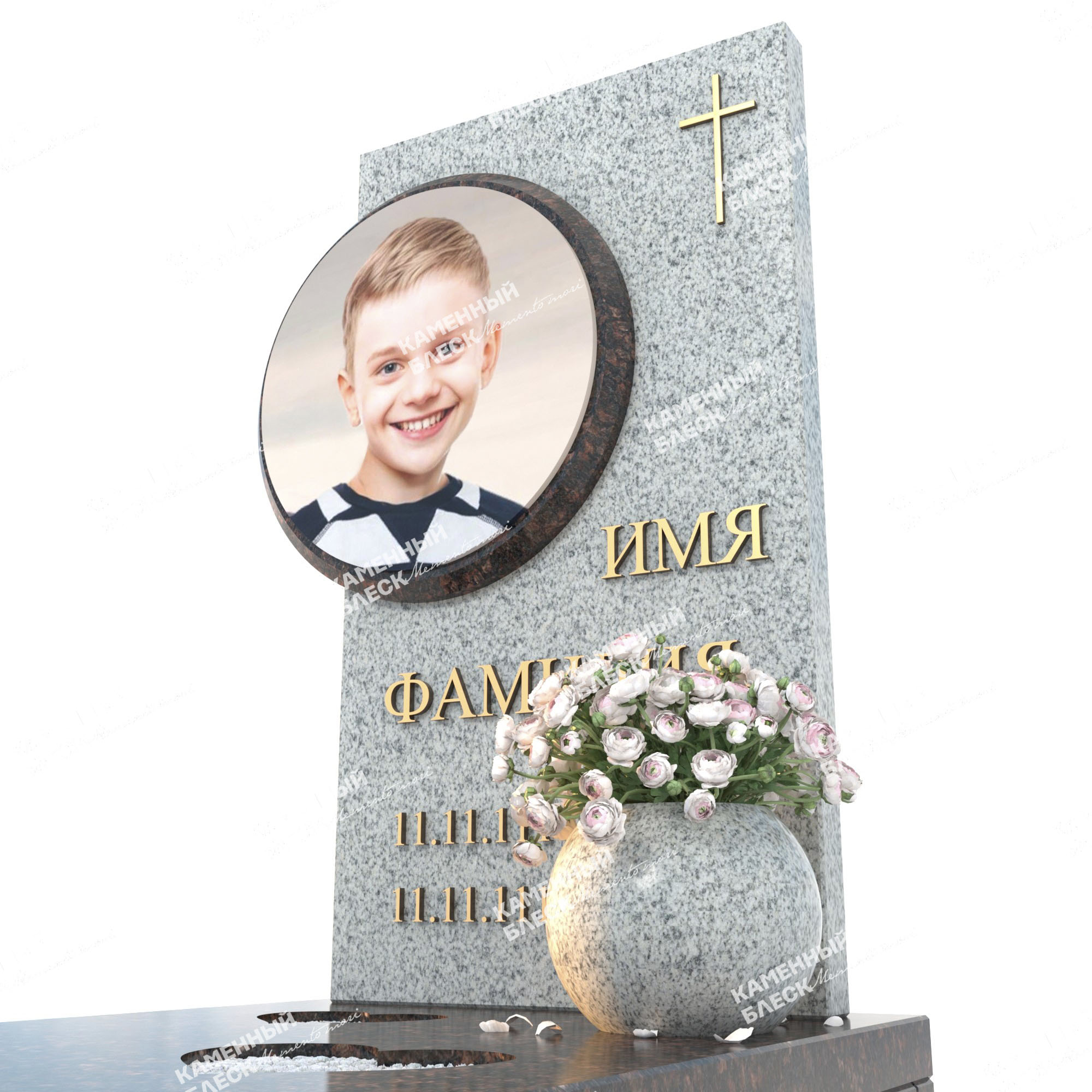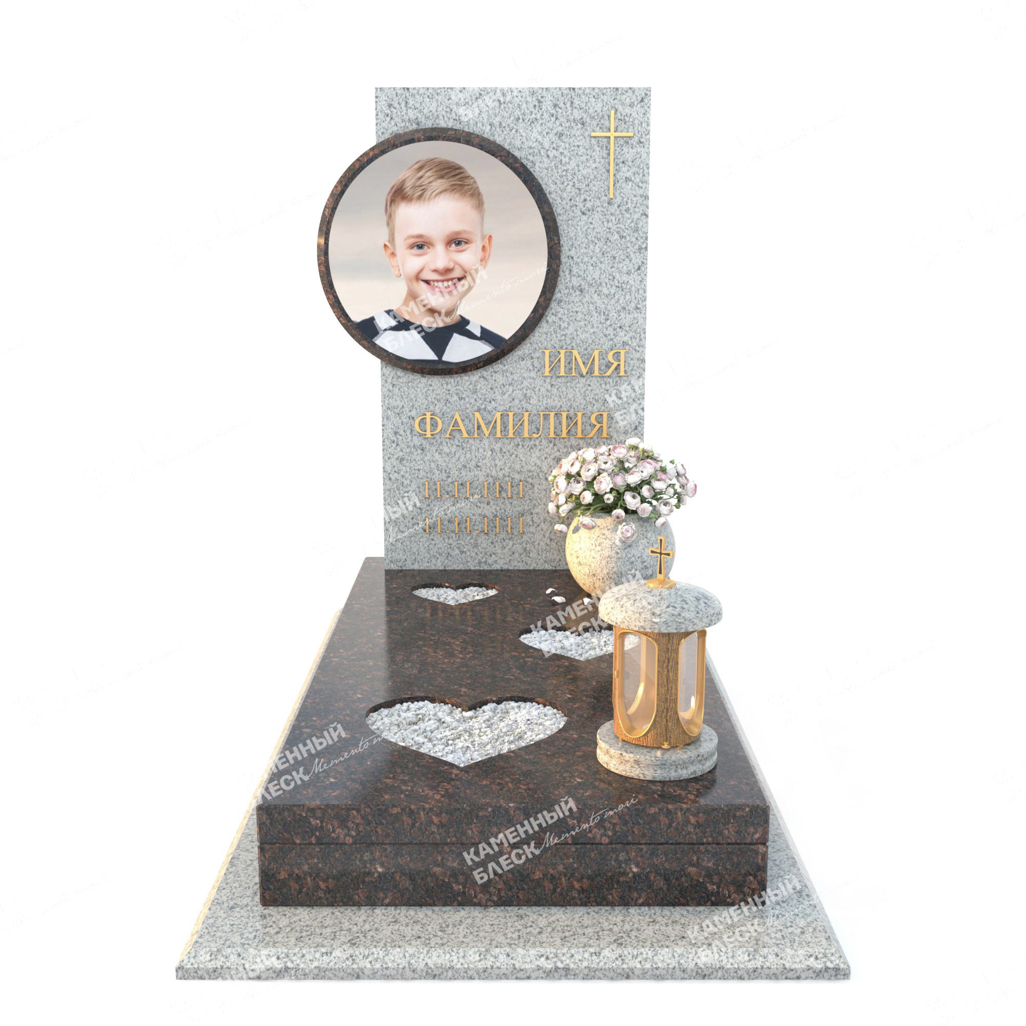 Эксклюзивный детский памятник выполнен из двух видов гранита Мансуровский и Габбро-Диабаз. Накладные элементы caggiati являются статусным мемориальным оформлением и служат прекрасным дополнением к данному комплексу. Фотография на стеклянном медальоне выполнена при помощи высоких технологий, что влияет на хорошую цветопередачу и не допускает выгорания на солнечных лучах. Так же комплекс можно дополнить различными элементами декора: вазы, лампады, статуэтки и др.