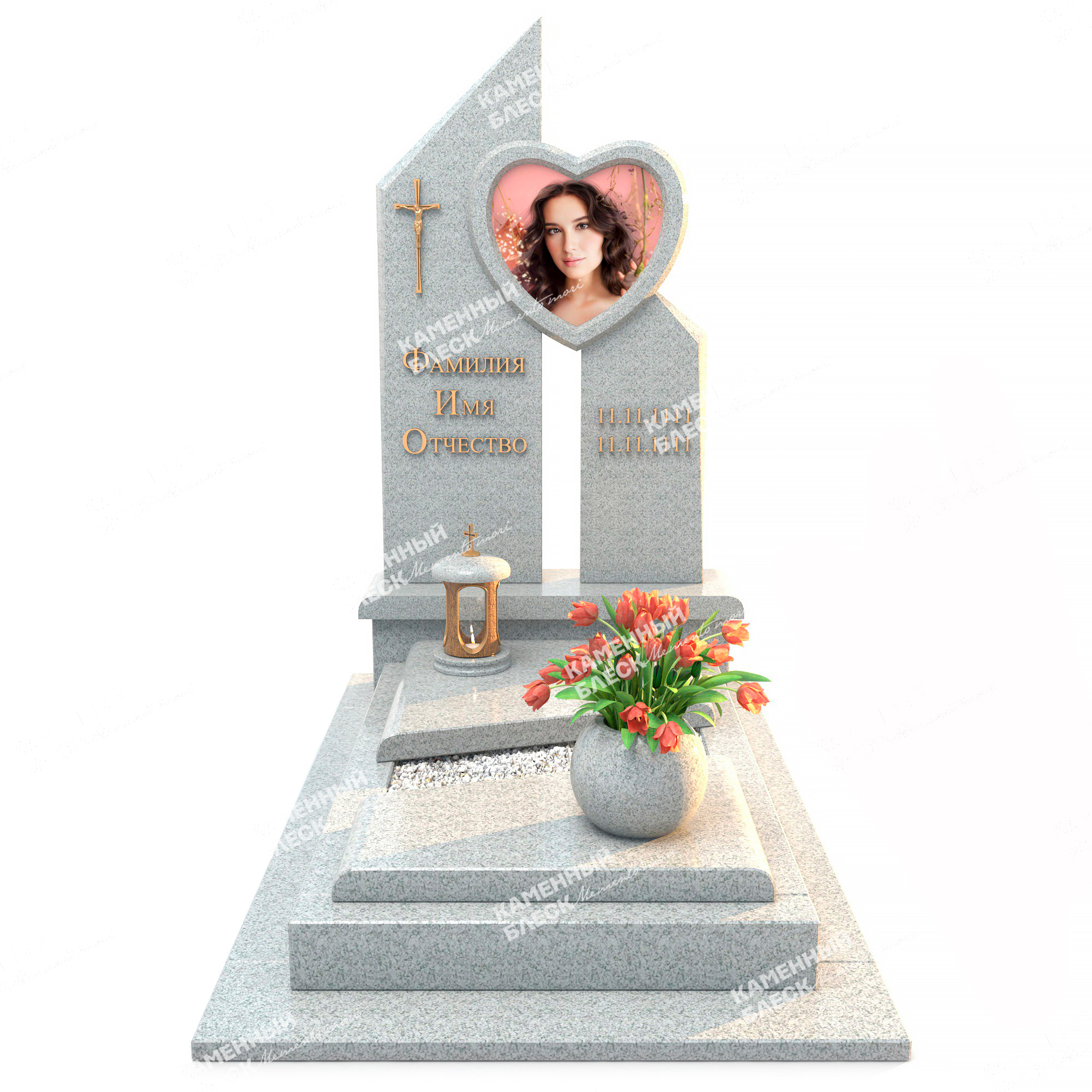 Очень стильный комплекс сочетает в себе прямые линии с плавными резными формами. Две стелы имеют острые формы, направленные вверх, а центральный элемент в виде сердца объединяет весь монумент. Врезанный цветной медальон из стекла превосходно дополняет данную композицию. По желанию могут быть добавлены различные элементы декора. Например, ваза, лампада или статуэтка.
