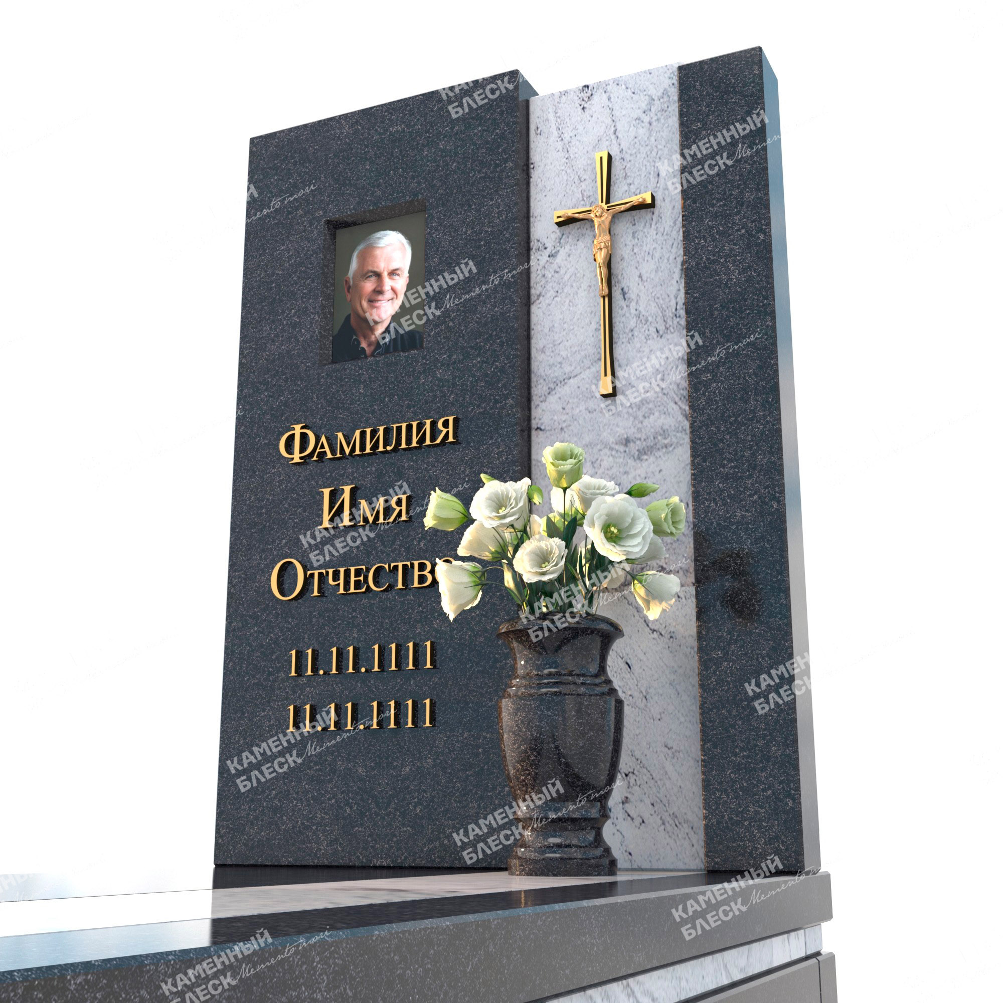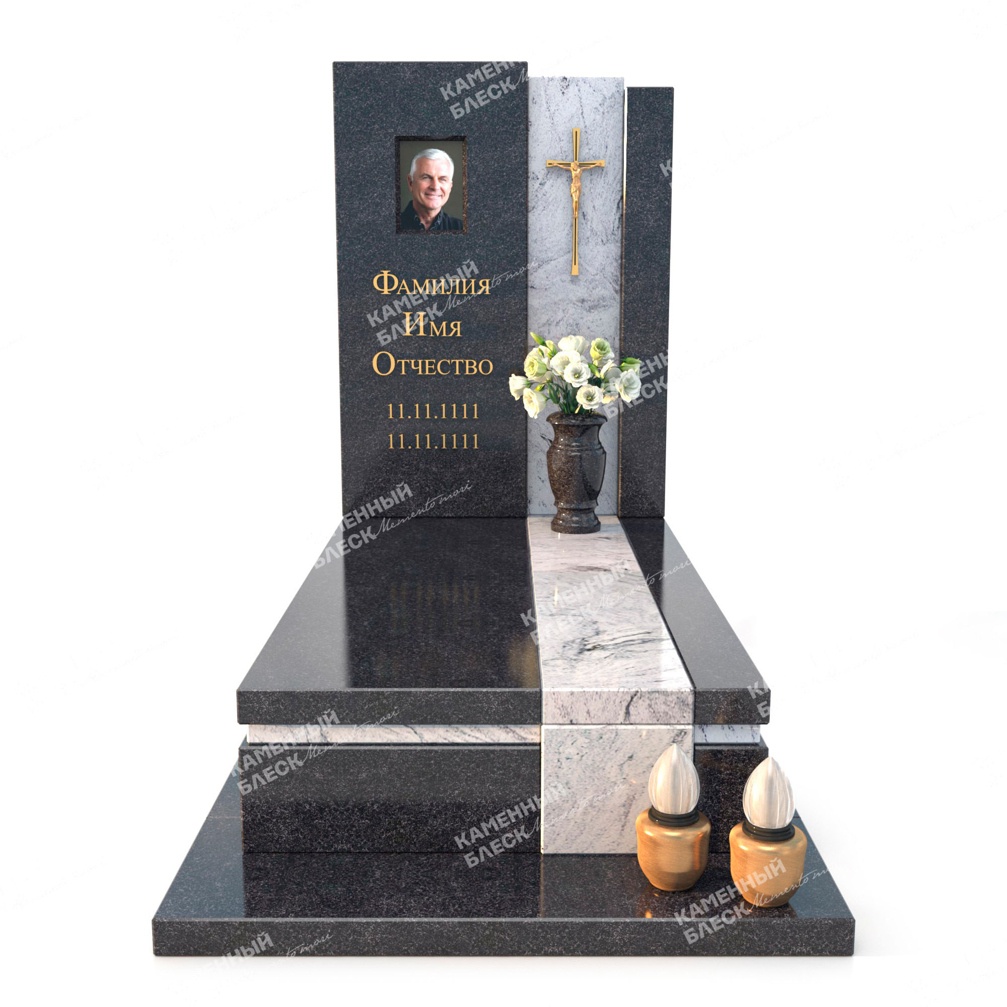 Эксклюзивная композиция собрана из двух видов гранита Габбро-Диабаз и Висконт Вайт. Строгие линии перетекающие из стелы в надгробную плиту делают композицию более лаконичной и уникальной. Информация об усопшем нанесенная с помощью накладных элементов caggiati придает памятнику больше индивидуальности. Стеклянный медальон изготовленный по особой технологии, отчетливо передает все цвета и не подвергается выгоранию на солнечных лучах. Монумент так же можно дополнить различными элементами декора: ваза, лампада, статуэтка и др.