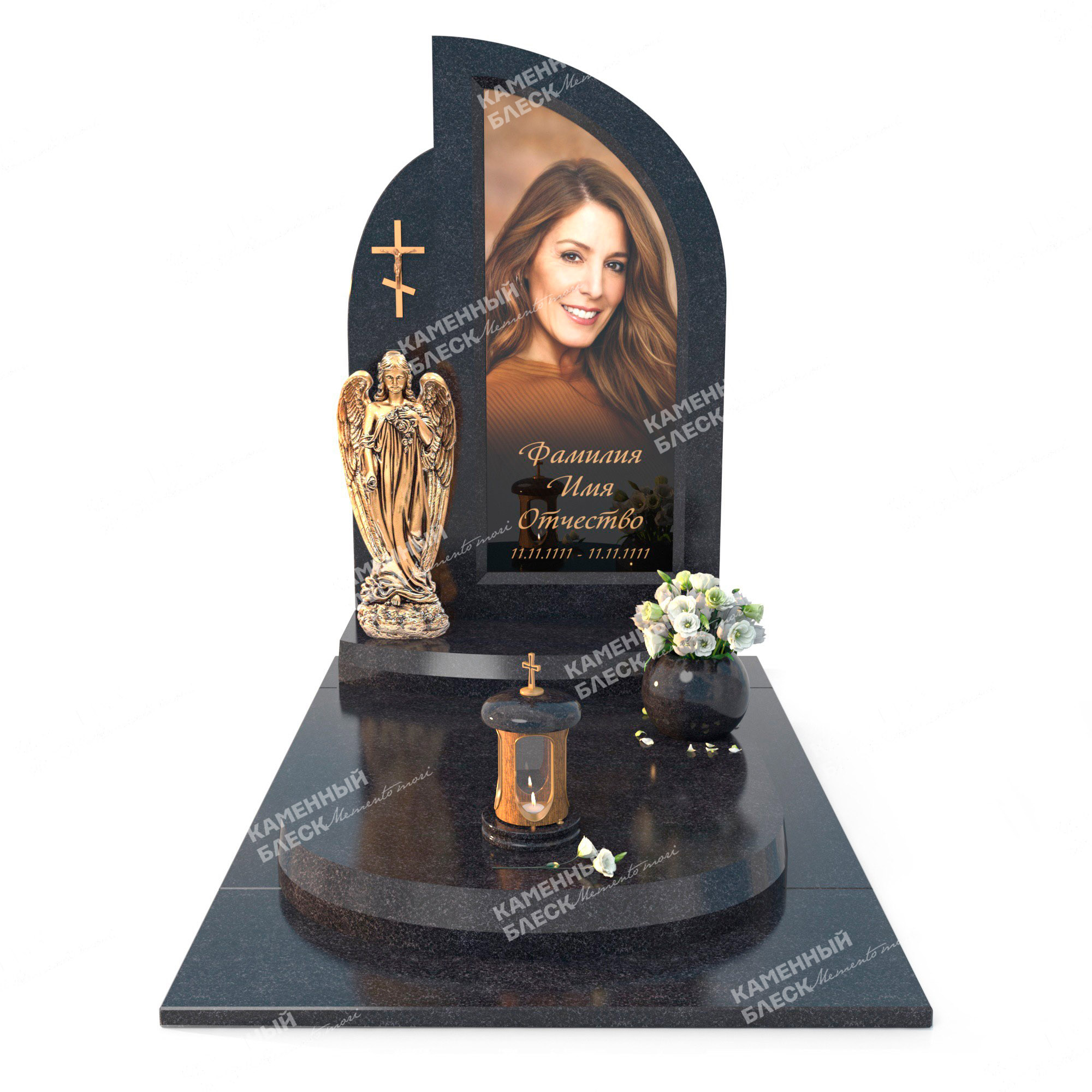 Этот эксклюзивный надгробный памятник изготовлен из гранита Габбро-Диабаз. Стела изготовлена с применением плавных линий, что делает ее более «женственной». На постаменте установлена скульптура в виде ангела, что служит дополнительным украшением. Фотография нанесена на стеклянный медальон, где так же располагается информация об усопшем. Данный комплекс можно дополнить лампадой, вазой и другими элементами декора.