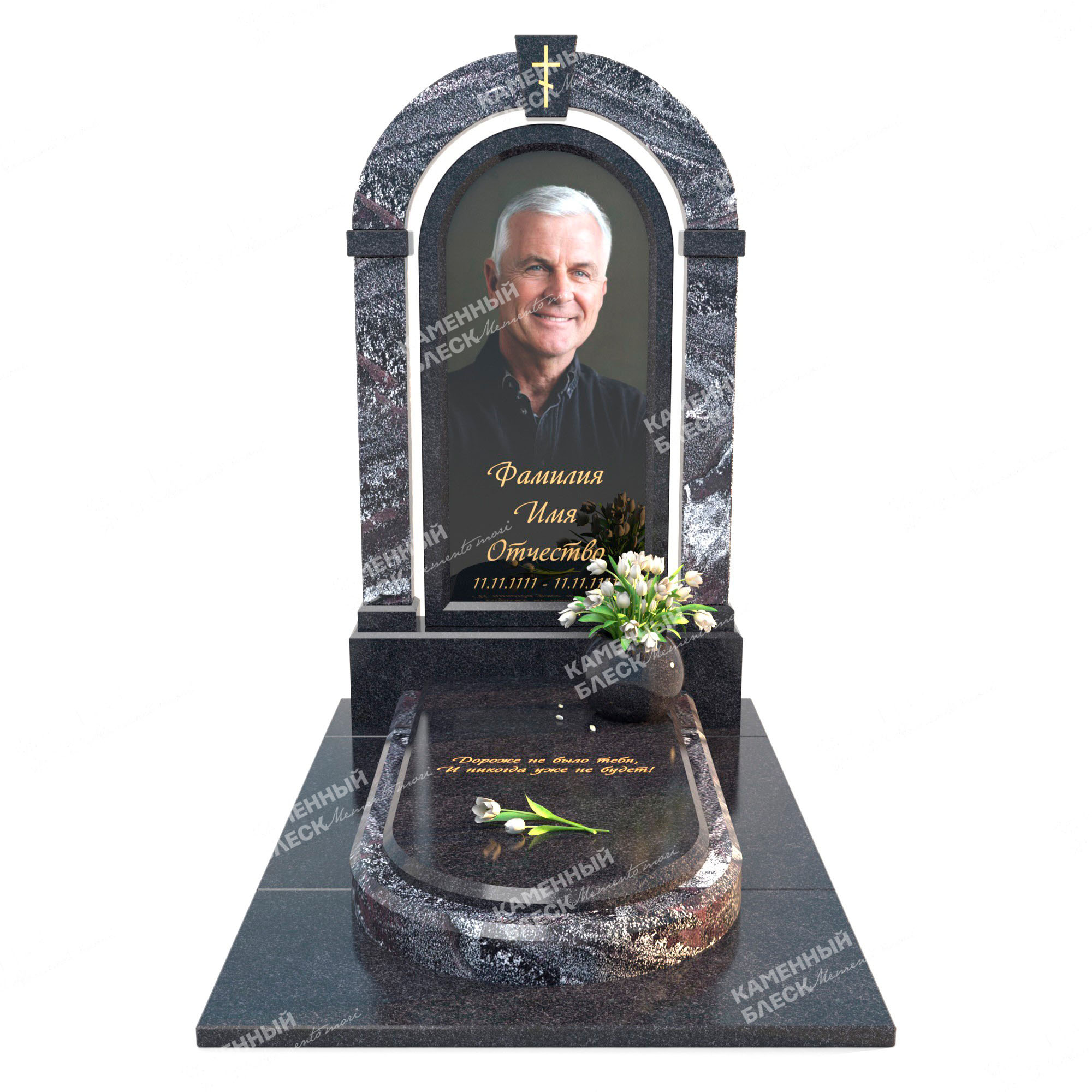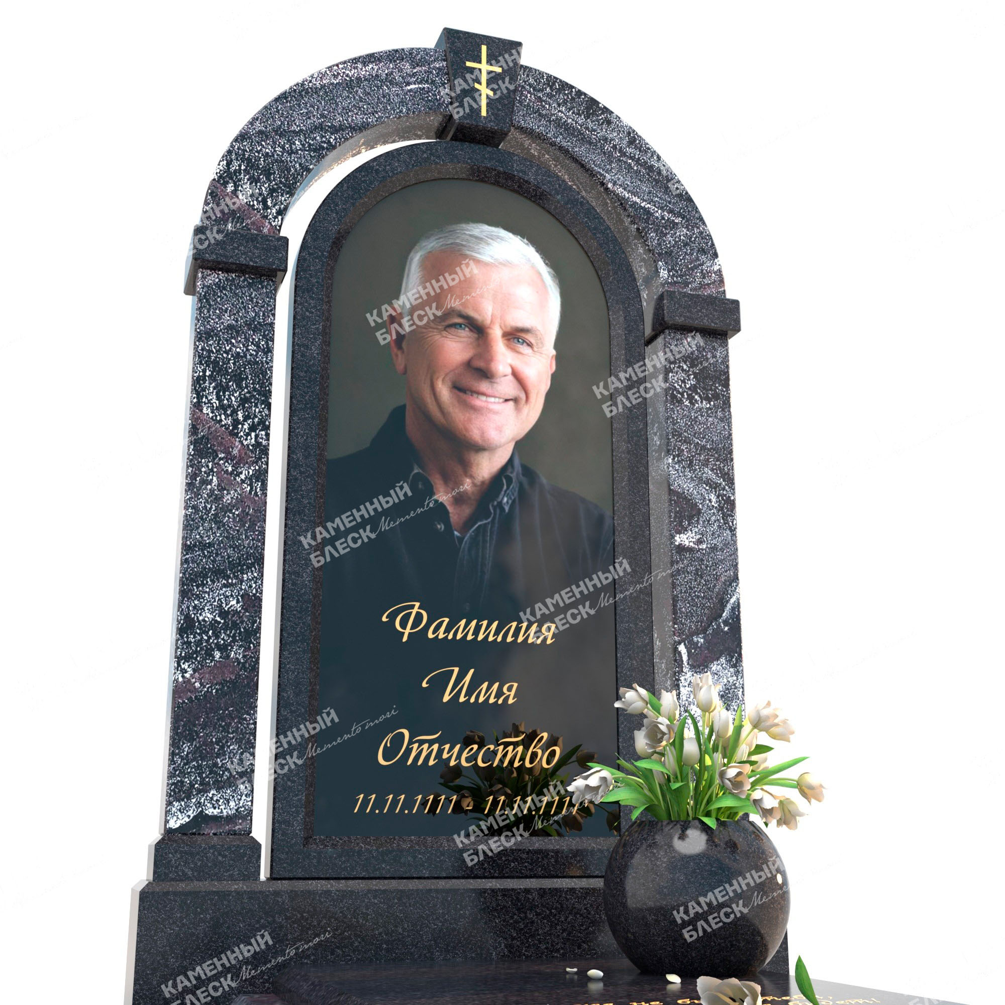 Эксклюзивный памятник выполнен из двух разновидностей гранита, которые прекрасно дополняют друг друга. Стела – Габбро-Диабаз расположена внутри арки из Гранатового-Амфиболита. Фотография нанесена на стеклянный медальон, где так же располагается информация об усопшем. На надгробье нанесена эпитафия путем применения глубокого пескоструя, которая покрыта сусальным золотом. Данное решение придает тексту более объемный и красивый вид. Композицию можно дополнить вазой, лампадой и другими элементами декора.