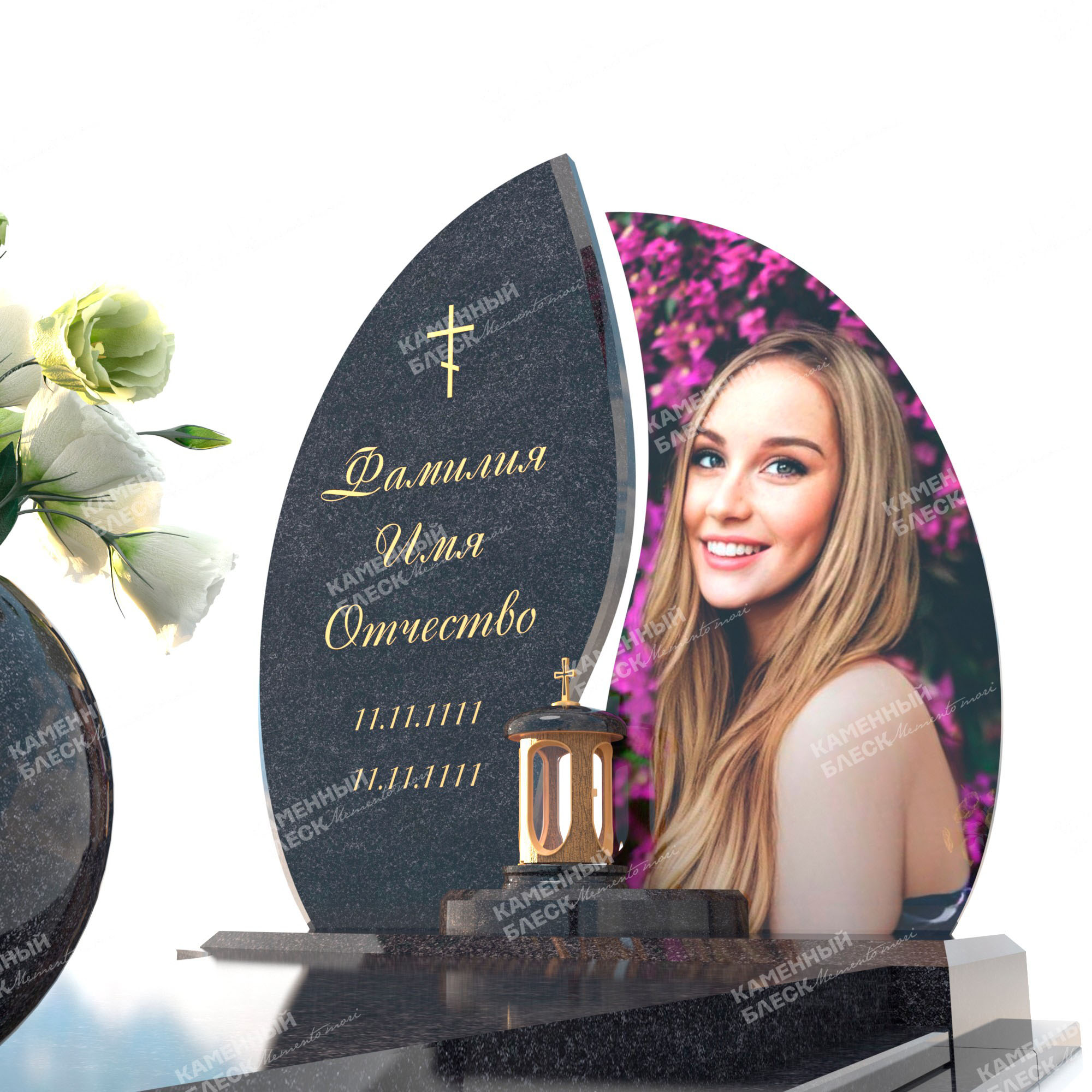 Художественное оформление в данной композиции представлено глубоким пескоструем, а в качестве декора использовали гранитные лампаду и вазу шар. Слегка открытое фигурное надгробие так же показывает нежность и утонченность в эксклюзивном памятнике от Каменного блеска.